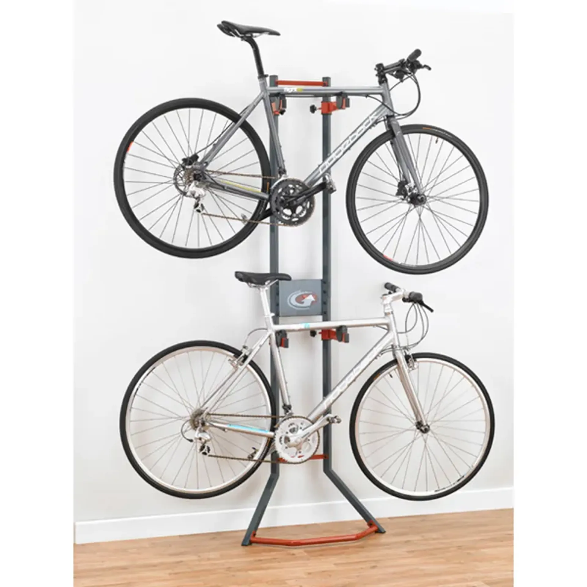 The platinum gravity bike rack provides safe, secure, and convenient storage of 2 bikes in an apartment, office, garage, or almost anywhere there is available wall space